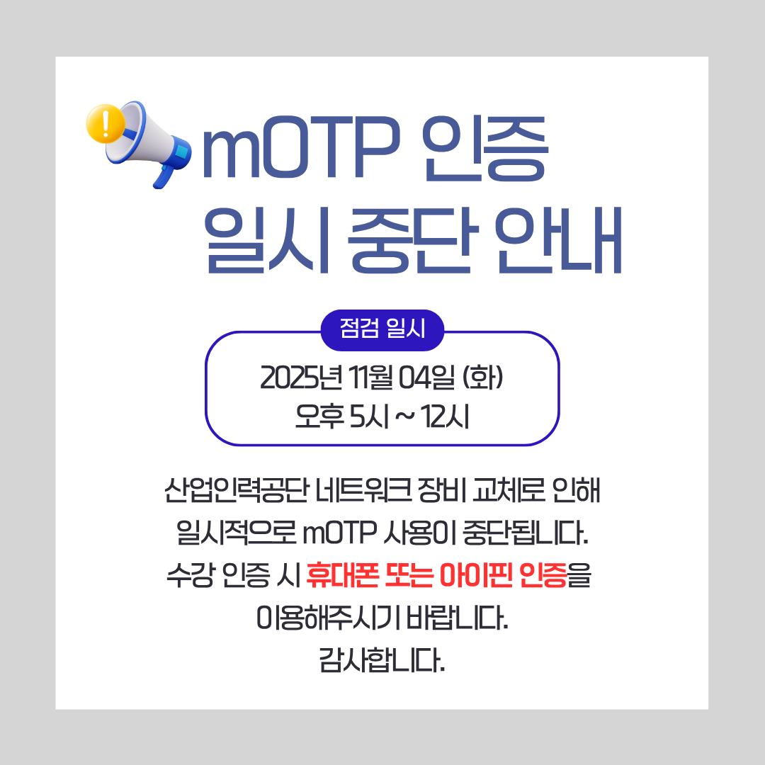 산업인력공단 네트워크 장비 교체로 인해 일시적으로 mOTP 사용이 중단됩니다.