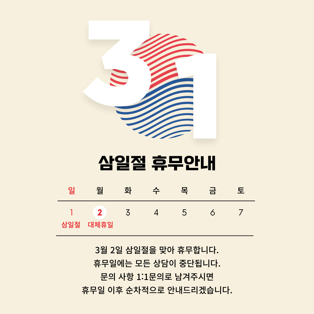 - 삼일절(대체휴무) : 2026년 3월 2일 (월)